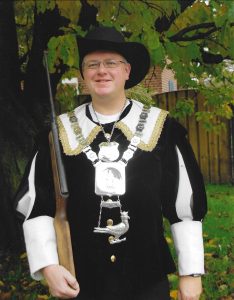 Ieder jaar op onze Gildedag gaan we koningsschieten. Degene die het schot lost waarbij de vogel omvalt, is koning.